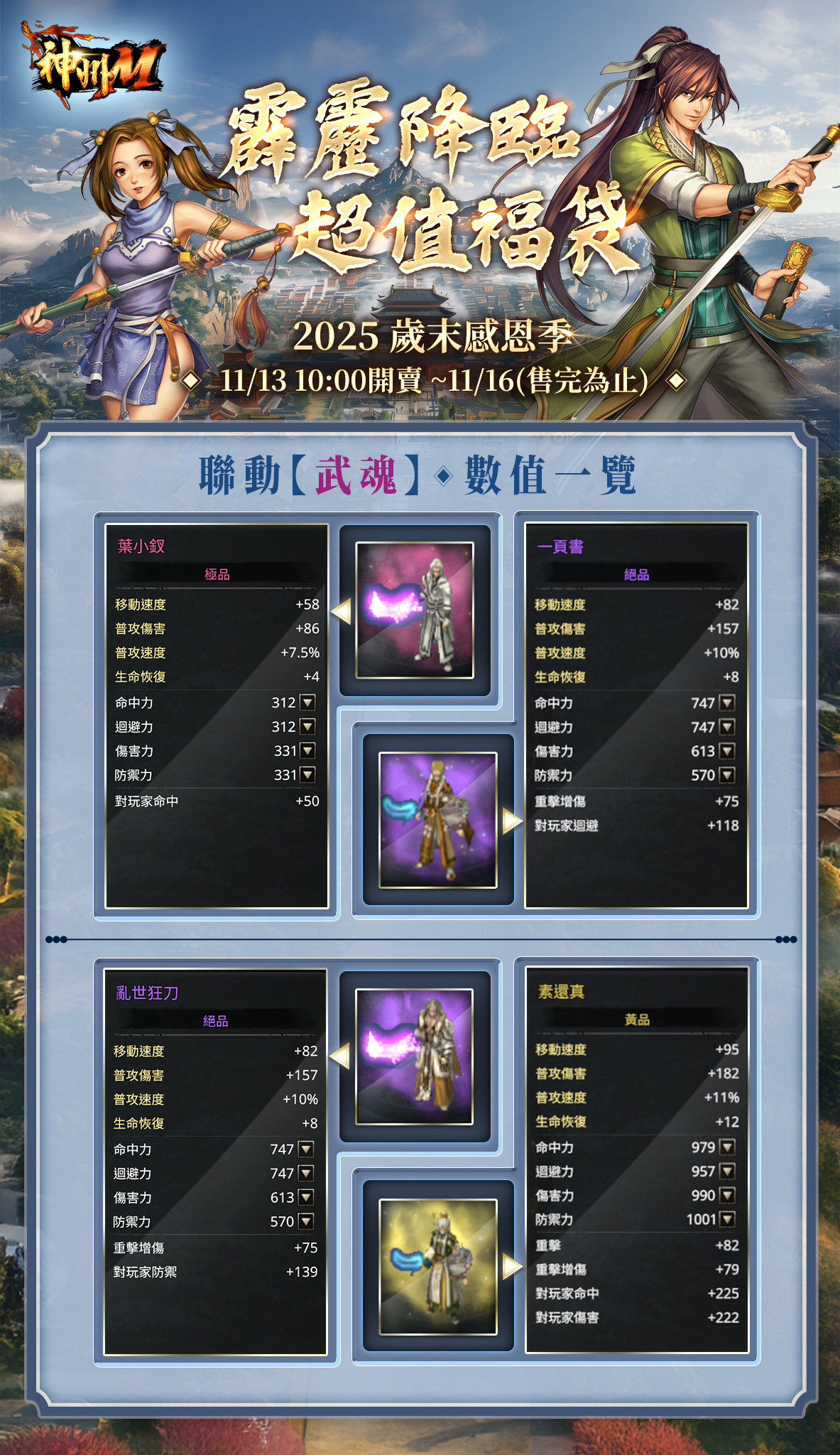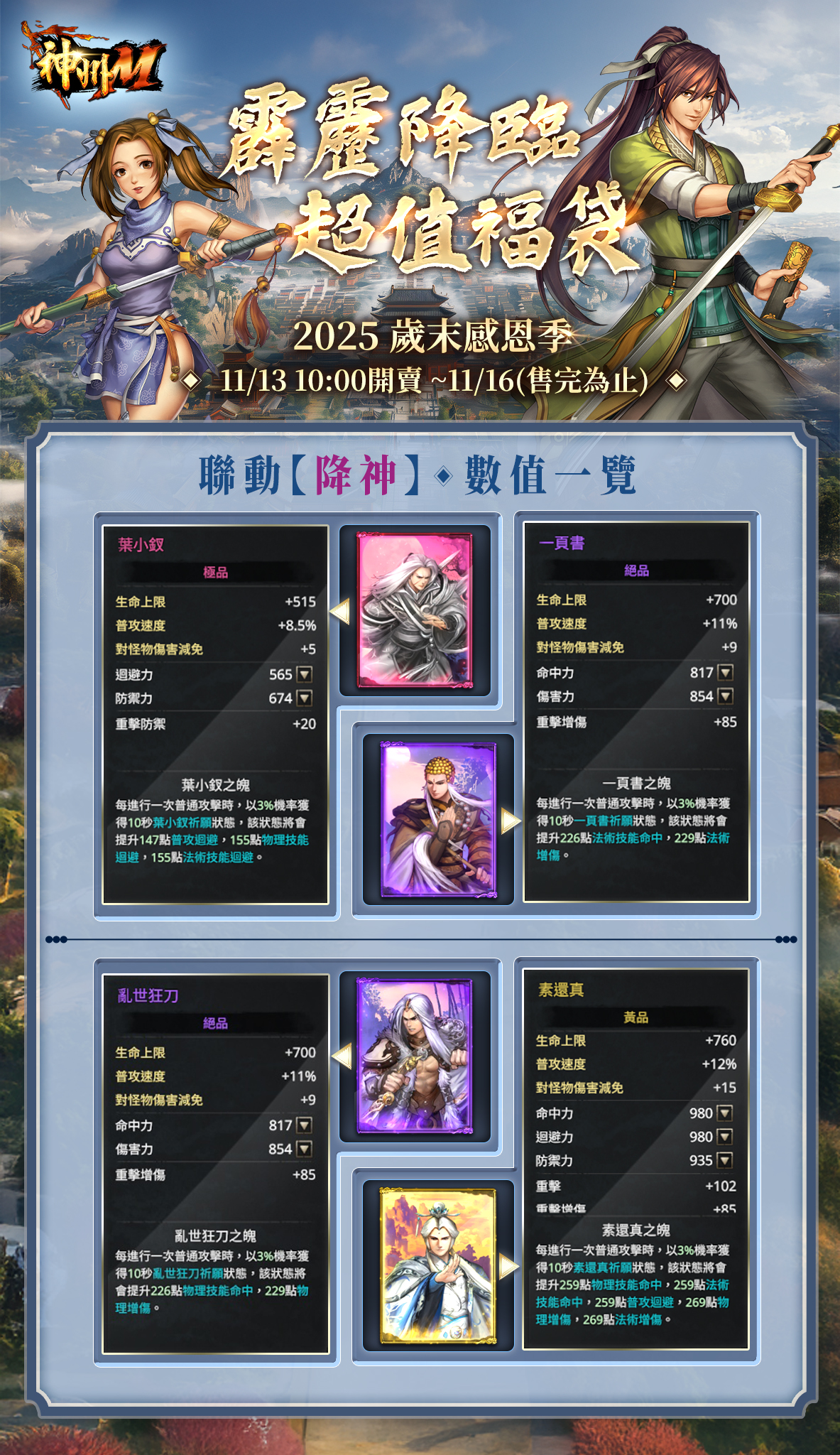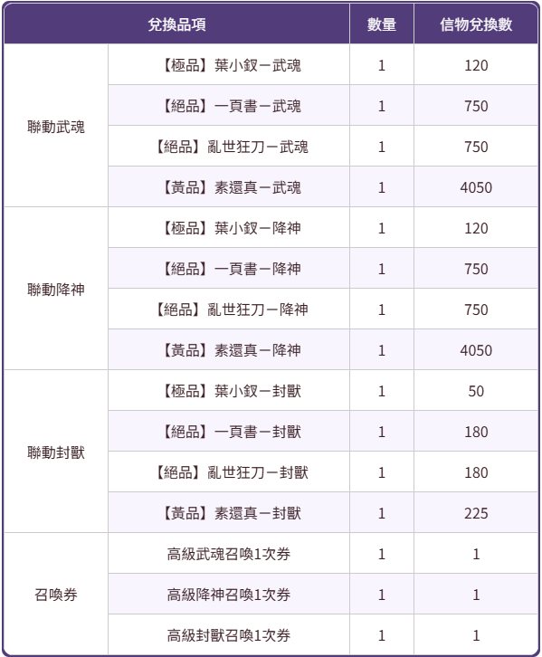 兌換「素還真」、「一頁書」、「葉小釵」及「亂世狂刀」聯動角色的武魂/降神/封獸等豪華虛寶,