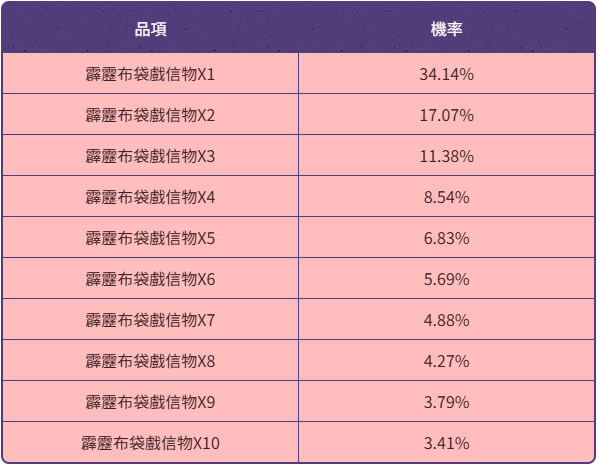 「霹靂布袋戲信物福袋」將可隨機獲得「霹靂布袋戲信物」(1~10個)