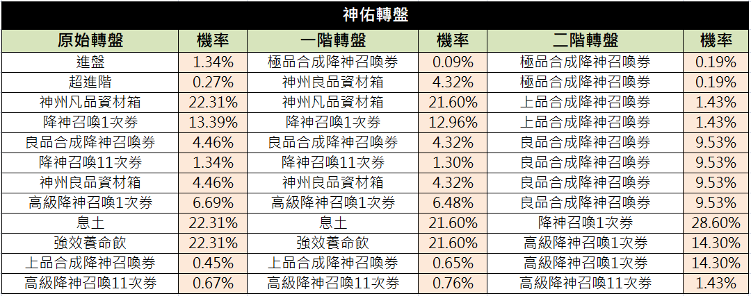 以下為「神佑轉盤」-機率公布